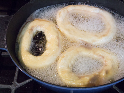 Place as many bagels as will fit comfortably in the sugar water. Boil 1 ½ minute, flip and boil for an additional 1 ½ minute.