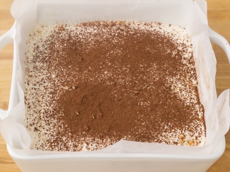 5. Spoon ⅓ of the cream-yogurt mixture over the lady fingers, spread evenly, and sprinkle with cocoa powder. Repeat with one more layer of lady fingers, cream-yogurt mixture, and cocoa powder. Cover and chill in the freezer for at least 3 hours.