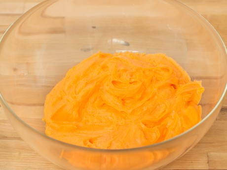9. In a medium-sized bowl, mix butter with ½ cup (125 g) icing sugar. Continue gradually adding icing sugar until all sugar is mixed in. Mix in cream and vanilla. Split frosting into two bowls equally. Colour one bowl of frosting with orange food colouring until bright orange.
