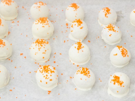 16. Decorate with orange sprinkles and refrigerate. When bites are chilled, place in small paper liners.