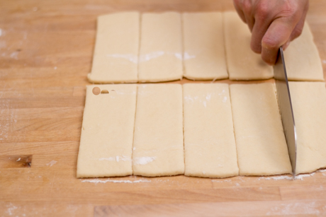13. Cut lengthwise into three 2-inch-wide strips. Cut each crosswise into three 4x2-inch rectangles.