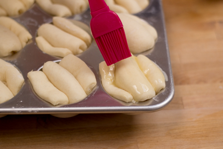 15. Place the folded dough into one muffin tin cavity, and lightly brush the top with melted butter.