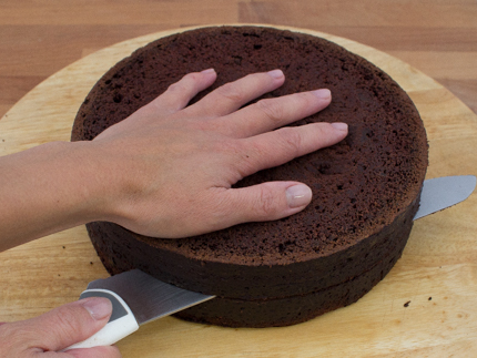 With a steady hand, slice the chocolate cake in half. Carefully remove the top layer.