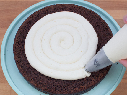Place the bottom layer onto a plate or turntable. Starting from the centre, pipe buttercream in concentric circles onto the cake layer. Pipe a second layer of buttercream over the first layer. Smooth cream with an offset spatula. Place the top layer onto the piped buttercream, gently pressing down.