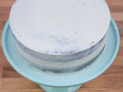Spread a thin layer of the peppermint buttercream onto the top and sides of the cake; this is the crumb coat.