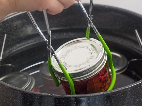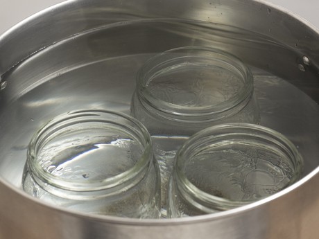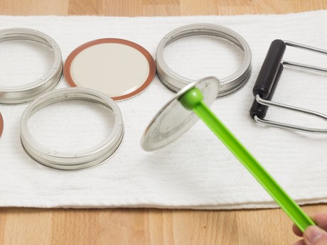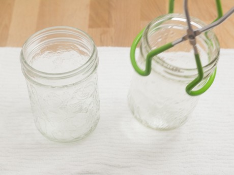 2. Once the bubbles have subsided, submerge the canning lids into the hot water. Do not boil the canning lids, as this may cause the adhesive ring in the lid to deteriorate and create a poor seal. When ready to use, carefully take the jars out with tongs. Carefully pour the water out of the jars and place right side up, onto a clean kitchen towel. Alternatively, leave the jars in the hot water until needed.