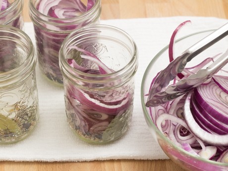 5. In each of the sterilized jars, add 1 teaspoon each of peppercorns, mustard seeds, coriander seeds, and a bay leaf. With a pair of clean kitchen tongs, divide the sliced red onions evenly amongst the 5 jars.