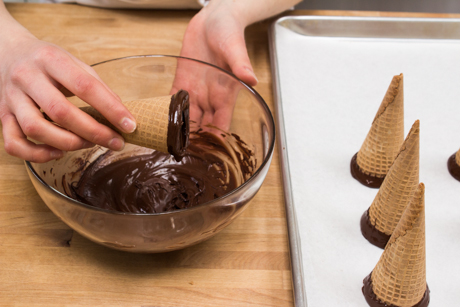 1. Line a baking sheet or plate with parchment or waxed paper and set aside. Melt the chocolate in the microwave for 30 second intervals, stirring between each interval until the chocolate is completely smooth. Dip the open end of each sugar cone in the melted chocolate, then transfer to the parchment lined baking sheet. Once all the cones have been dipped in chocolate, set them aside to set while preparing the filling.