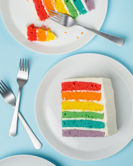 Using an offset spatula, spread the cake with about 2/3 cup (145 g) of frosting. Repeat layering with frosting the blue, green, yellow, orange and red cakes.