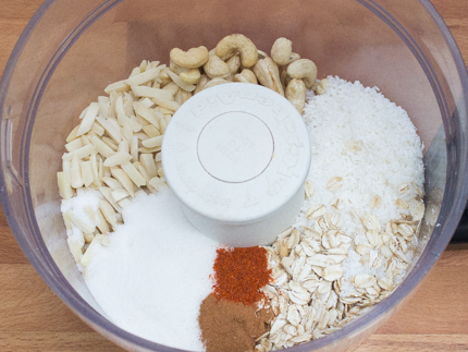 In the bowl of a food processor fitted with the metal blade, combine the unsweetened coconut, raw cashews, blanched almonds, oats, Redpath Granulated Sugar, salt, cayenne pepper, and ground cinnamon. Process until the nuts and coconut are a medium-fine grind. Transfer the contents into another bowl.