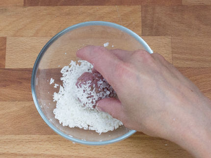 Scoop about a heaping tablespoon of the dough into palms of slightly dampened hands and form into balls. Roll balls in the shredded coconut and place onto a parchment lined baking sheet. Place into the freezer to firm up. Eat from frozen or place into the fridge to defrost if you prefer softer bites.
