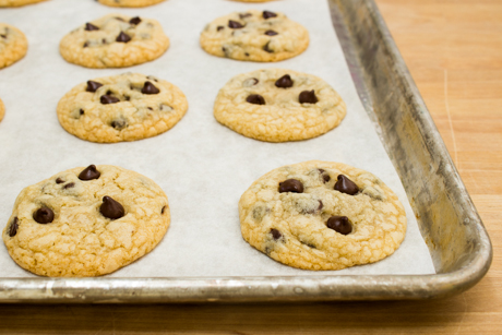 - They cool. The action doesn’t stop when your cookies come out of the oven. As they cool, the liquified sugars cool and harden, producing crisp bottoms and edges, and the air inside cools, causing the cookie to deflate slightly.