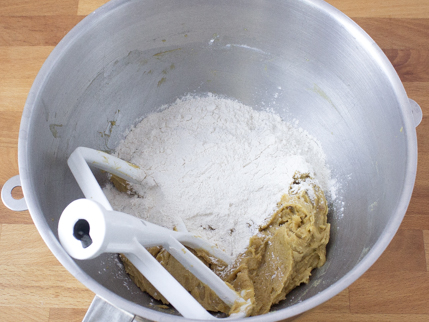 Transfer half of the dry ingredients into the batter. Mix on low speed until just combined. Add in the remainder of the flour mixture. Mix on medium-low speed until well blended; about 2 minutes.