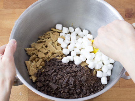 Fold in the broken graham cracker bits, chopped dark chocolate, and mini marshmallows.
