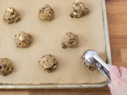 With a small ice cream scoop, scoop even-sized balls of dough onto the prepared baking sheet. Roll the dough into balls.