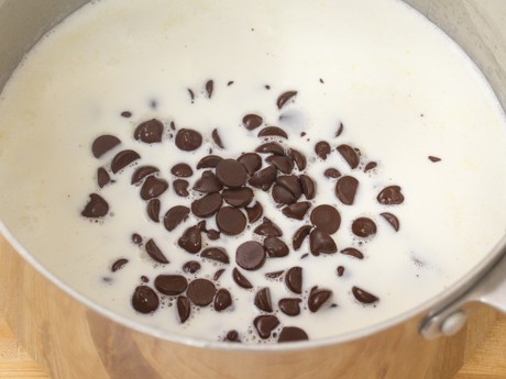 1. In a medium saucepan, whisk together cream and milk. Warm over medium-low heat. Remove from heat and add chocolate and stir until it has completely melted and is smooth.