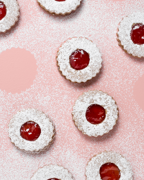 Strawberry Linzer cookies can be kept layered between parchment in an airtight container in the refrigerator for up to 2 days.