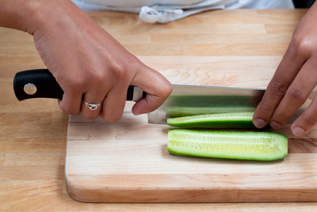 1. Give the cucumbers a rinse pat them dry and cut the tip off of each end. Cut the cucumbers into quarters and thinly slice the quarters.