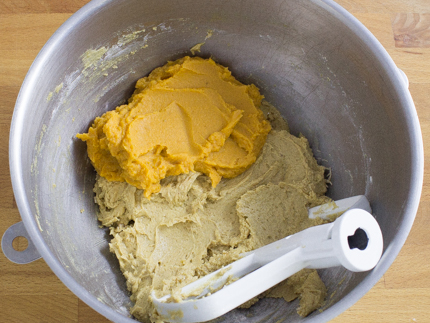 Add in a third of the dry ingredients. Mix on low until just combined. Transfer half of the sweet potato mixture into the batter. Blend until just combined; repeat process, ending with the dry ingredients.
