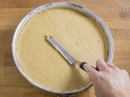 Pour the sweet potato batter into the prepared pan, smoothing out the top.