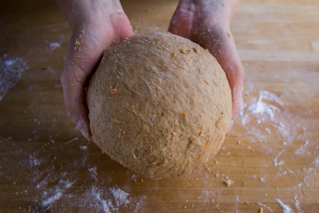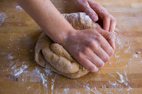 7. Once the dough comes together, turn it out onto a lightly floured surface and knead with your hands until the dough is smooth