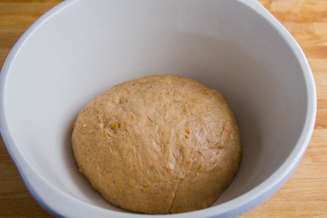 6. Add the flour mixture to the sweet potato mixture and stir in gently. Continue to add the remaining 2 1/2 cups of flour, 1/2 cup at a time, until the dough begins to pull away from the sides of the bowl. Note: you may not need to use all of the flour.