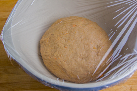 8. Oil the bottom of a large bowl and place the kneaded dough in the bowl. Cover the bowl with plastic wrap or a damp towel and set in a warm place to rise.