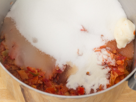 2. Transfer the chopped peppers to a large pot with the remaining ingredients, minding to sprinkle the pectin in a little bit at a time to not form clumps.