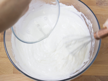 While whisking, pour the dissolved gelatin into the yogurt mixture. Whisk for 30 seconds.