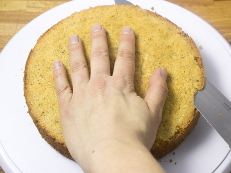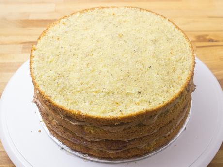 Split each cake in half, horizontally. Transfer one cake layer to a cake turntable or cake stand cut-side up.