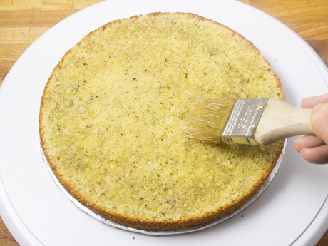 Repeat brushing the cake with syrup and covering with a layer of frosting for the next two layers.