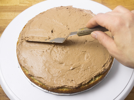 Spread about ¾ cup (99 grams) of the chocolate swiss buttercream evenly over the cake with an offset spatula. Place another layer on top.