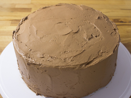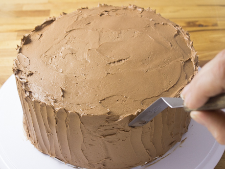 Coat the entire cake with a thin smooth layer of frosting to seal in the crumbs. Refrigerate for 30 minutes.