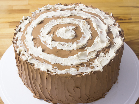 To create the rings on the top, roughly spread the reserved plain frosting in concentric circles on the top of the cake.