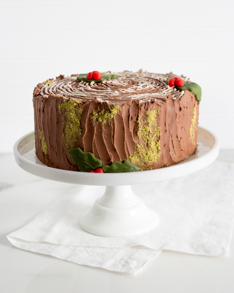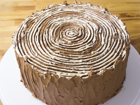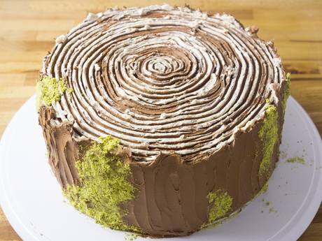 To create the bark, use an offset spatula or butter knife create vertical grooves on the sides of the cake.