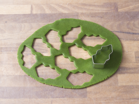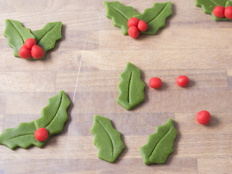 Colour 3 tablespoons (75 grams) of the marzipan green. Roll to ¼ inch (6 millimetre) thickness between two pieces of wax paper. Cut out leaves.