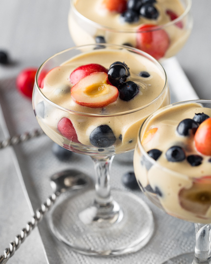 Zabaglione with Summer Fruits Zabaglione with Summer Fruits Zabaglione is an Italian favourite that comes in many forms, but we’ve decided to go with a custard-like version of this sweet treat. Served either chilled or warm, fresh fruit and just a bit of sweet wine make this grown-up dessert so irresistible, your inner child might convince you to lick the bowl! Categories: Puddings, Mousses & Custards Desserts Yields 8 servings Prep Time 5 minutes Cook Time 10 minutes Ingredients 1 ⅓ cup (353 g) fresh cherries, pitted and halved 1 ⅓ cup (345 g) fresh blueberries 6 tbsp (75 g) Redpath Granulated Sugar 6 large egg yolks ⅓ cup (80 ml) Marsala wine (another sweet dessert wine, such as Madeira or sweet sherry may be substituted) ¼ tsp (2 g) salt ¼ tsp (2.5 ml) almond extract Instructions In a bowl, toss together the cherries and blueberries. Divide fruit between 8 serving bowls, cover and set aside. Fill a medium pot with 2 inches (5 centimeters) of water and bring to a gentle simmer. Have ready a round bottomed, stainless steel or copper bowl that can rest on the top of the pot without touching the water. Off the heat, place the Redpath® Granulated Sugar, egg yolks, wine, and salt in the bowl. Immediately beat with an electric mixer or whisk until smooth. Set bowl over the simmering water and beat continuously, checking the water periodically to make sure it is not boiling. Beat mixture until it thickens to the consistency of soft whipped cream, and pools in ribbons when the beaters are lifted, about 10 minutes. Remove from heat and beat in almond extract Top prepared fruit with warm zabaglione. Serve immediately. CHEF'S TIPS For a nonalcoholic version, substitute white grape juice or apple juice for the wine Any other fresh, seasonal fruit may be substituted for the cherries or blueberries Zabaglione may be chilled before serving Puddings, Mousse & Custards Lemon Curd (Repurposed 3 Ways) Springtime Dirt Pudding Salted Dark Chocolate Crème Brûlée Sweet Golden Kugel Holiday Cranberry Cranachan Campfire Bananas Foster Piña Colada Layered Gelatin Dessert Vegan Chocolate Pudding Simple Ambrosia Salad Pumpkin Cheesecake Trifle with Brown Sugar Whipped Cream